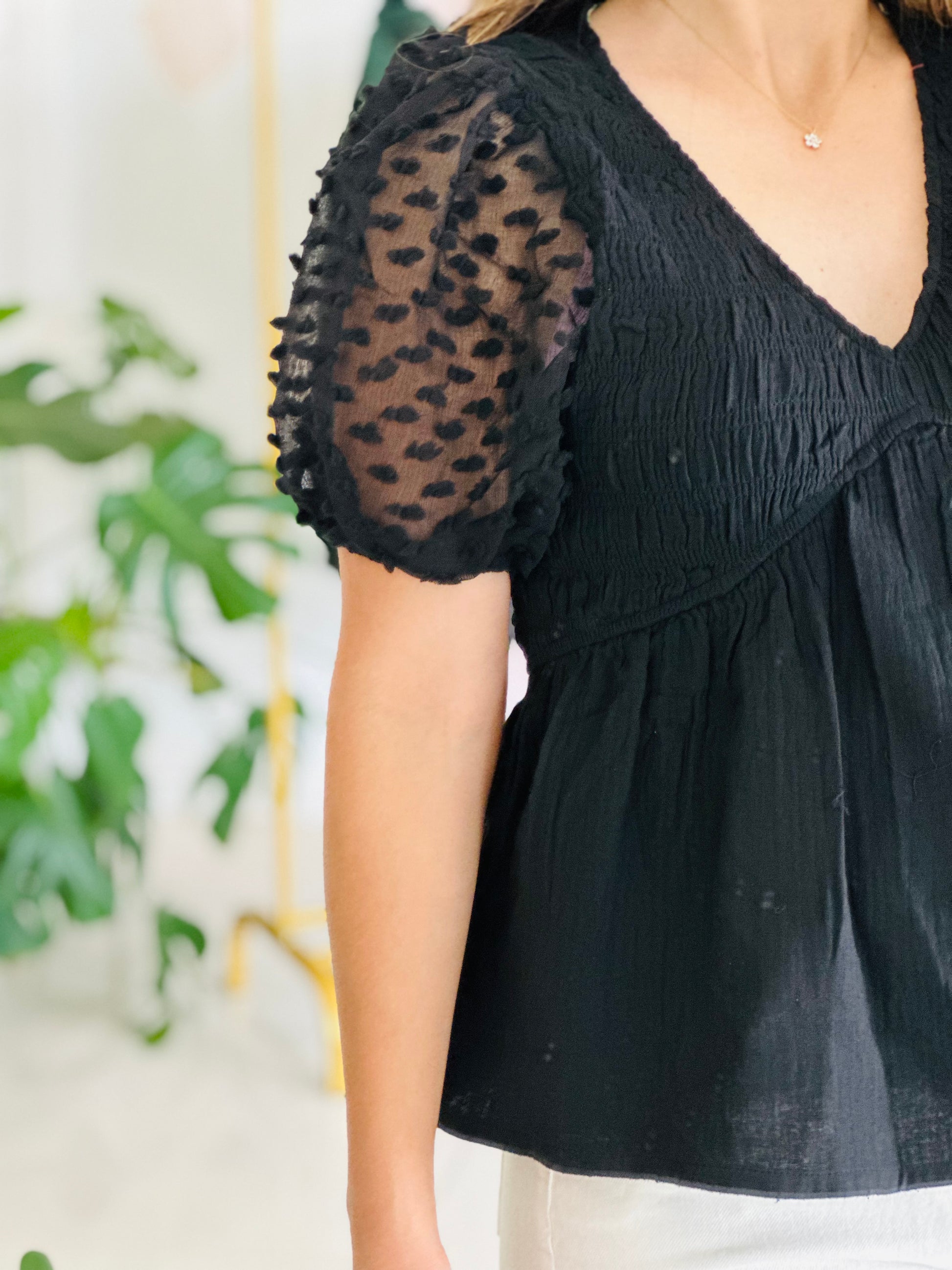 Smocking V-Neck 3D Floral Applique Detail Cuffed Puffed Sleeve.