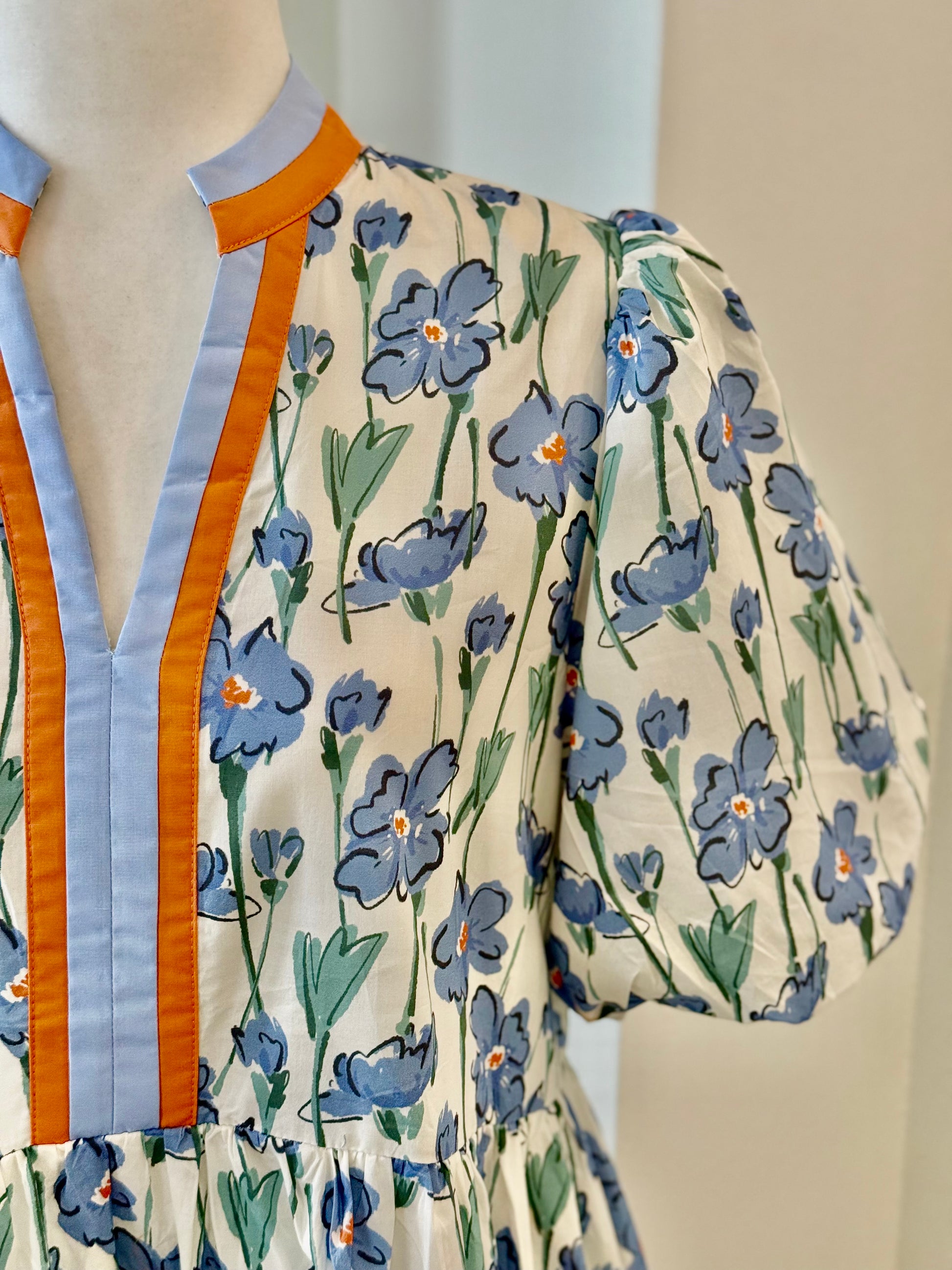 Multicolor floral print short bubble sleeve pullover tiered dress featuring multicolor band accent.