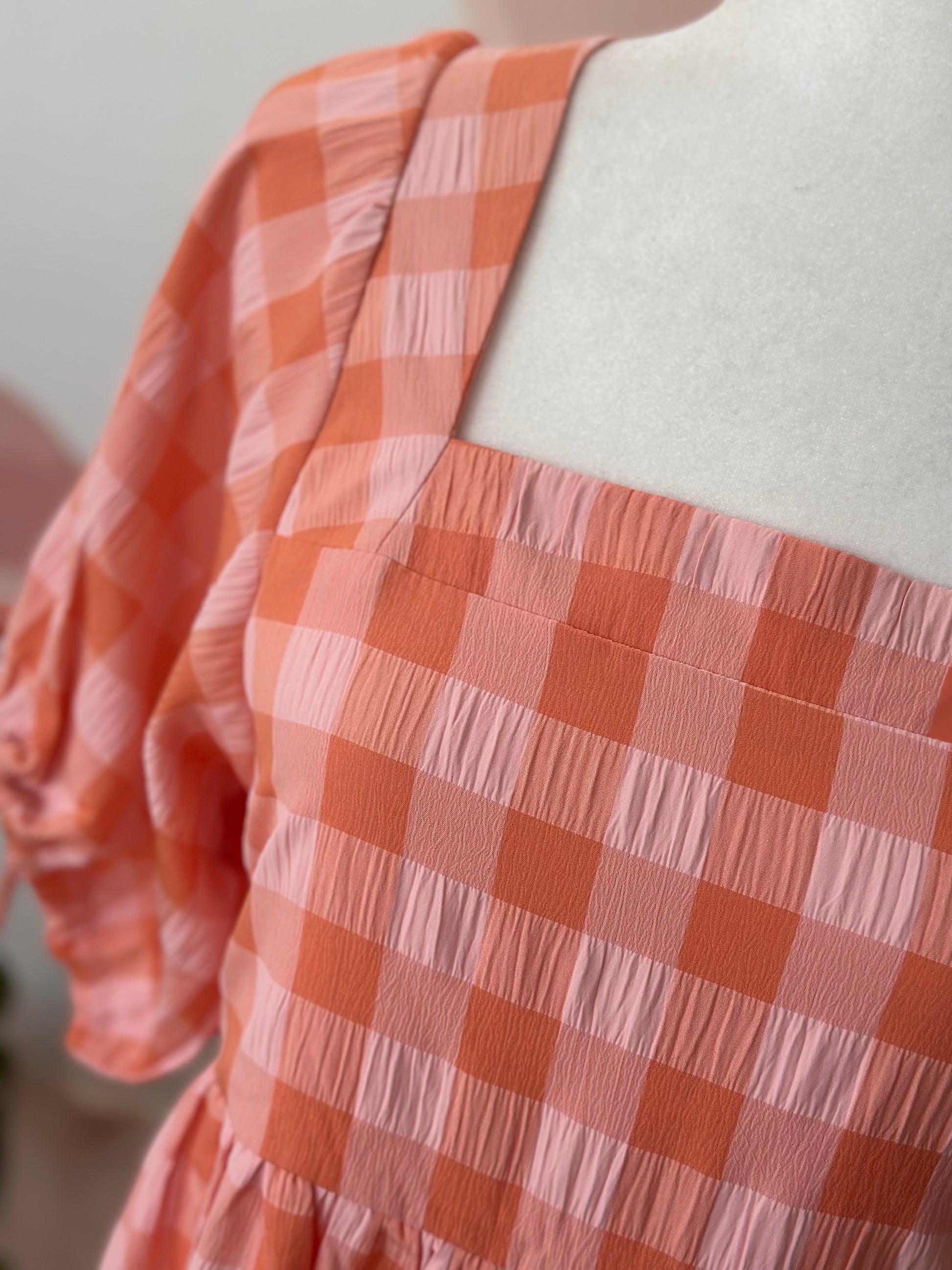 Charming gingham maxi dress with puff sleeves and tie details. Perfect for a casual day out.